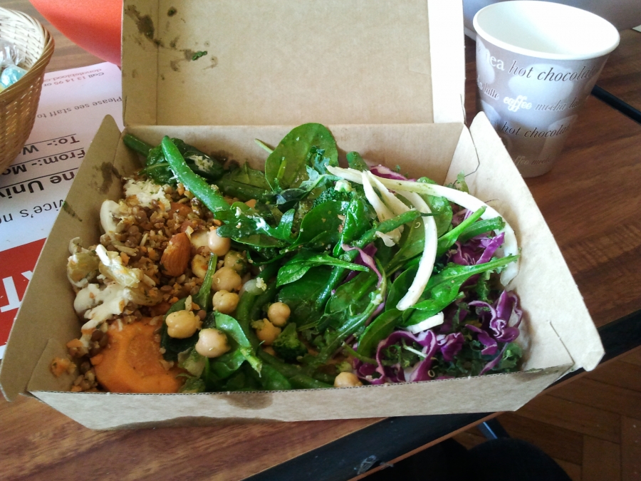 - Quinoa and purple cabbage; chickpeas, broccolli, spinach; mixed grain, sunflower seed and almond salad