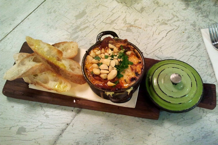 - Baked Eggs w. Chorizo, Almonds, Piquillo Pimientos Sauce And Queso De Cabra Goats Milk Cheese ($17)