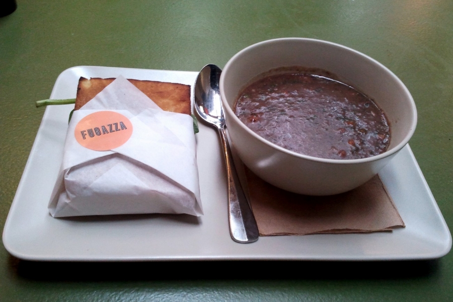 - Porchetta Fugazza – Shaved Italian Roast Pork, Roast Pumpkin, Aged Asiago Cheese, Baby Spinach – and Tuscan Bean Soup ($10)