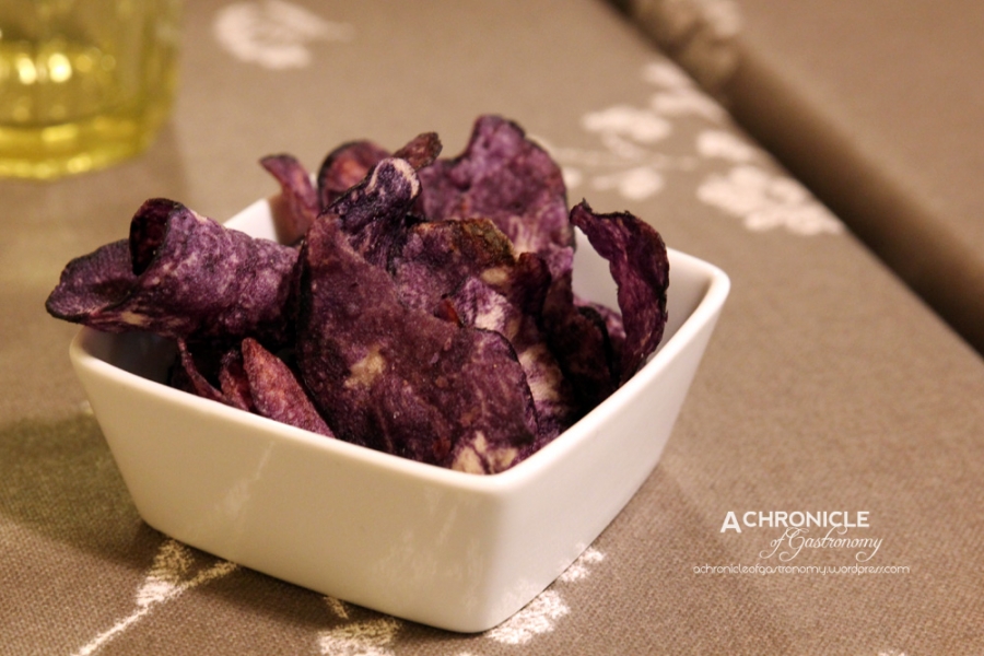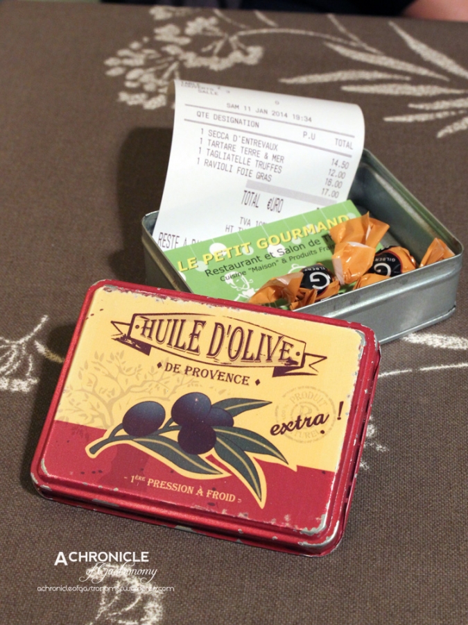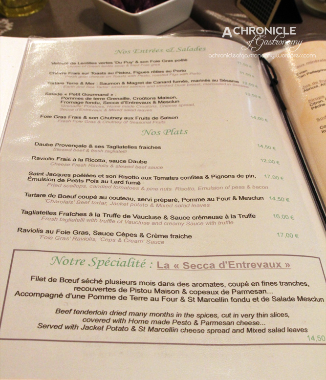As we tried to translate the menu on the board outside and determine if we should go into La Petite Gourmand, a lady came out and said they had an English menu inside. It turned out that she was the chef. The restaurant is very small, only seating 15, and all the tables were actually reserved but we had an hour to order and eat before having to clear out by ~8:30pm. We received a little bowl of purple potato chips while we were still looking at the menu. Mum’s first instinct was to go for the tagliatelle with local truffles and truffle sauce (€16) but was also tempted by the foie gras ravioli with creamy cêpes sauce (€17). She picked the truffle tagliatelle. I had the smoked salmon and smoked duck Magret tartare with sesame oil (€12) and dad had the special ‘Secca d’Entrevaux’, which was beef tenderloin which had been dried with spices and covered with pesto and Parmesan cheese. It came with a jacket potato, which was to be topped with a Marcellin cheese spread that came in a little jar (€14.50).