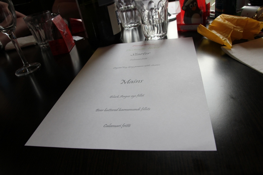 We had organised for a set menu, and my choices for the night were the prawns and chorizo for the entree and eye fillet steak as mains.