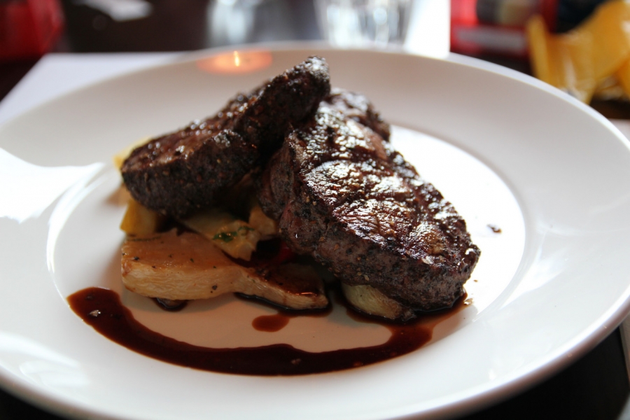 - 250g Black Angus Eye Fillet Steak w. Pepper Crust, Root Vegetables w. Red Wine Jus $29