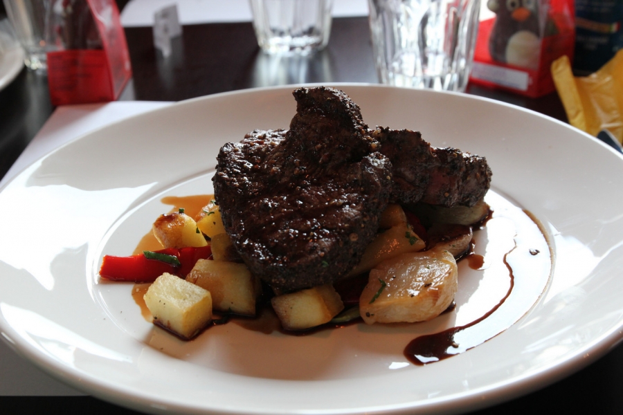 The steaks were presented on top of a bed of slightly crispy potatoes and a few slices of capsicum. All the eye fillet steaks were cooked to medium and had a lovely, crunchy pepper crust. I was much more impressed with the steak than the prawns.