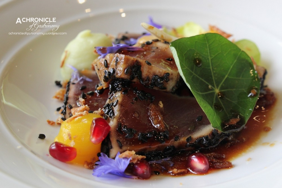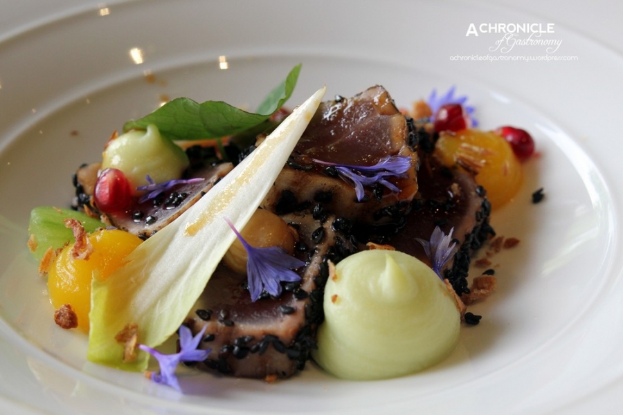 Next we had seared tuna with black sesame seeds. The tuna was accompanied by a number of different sauces and gels including wasabi, garlic and an acidic sauce as the base. I especially liked the combination of the acidic sauce and light wasabi flavour from the gel. This was my favourite dish from today.
