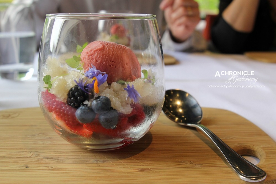 After the hearty pie, dessert was a refreshing relief. It consisted of a honey syrup and berries topped with strawberry sorbet and granita. The syrup didn’t seem to have been poured directly onto the fruit, which allowed their natural flavours and sweetness to come through. The sorbet was very good and I wished there was more of it, particularly with the 40 degree weather today!