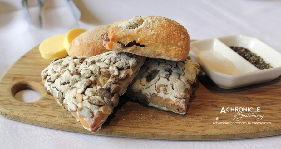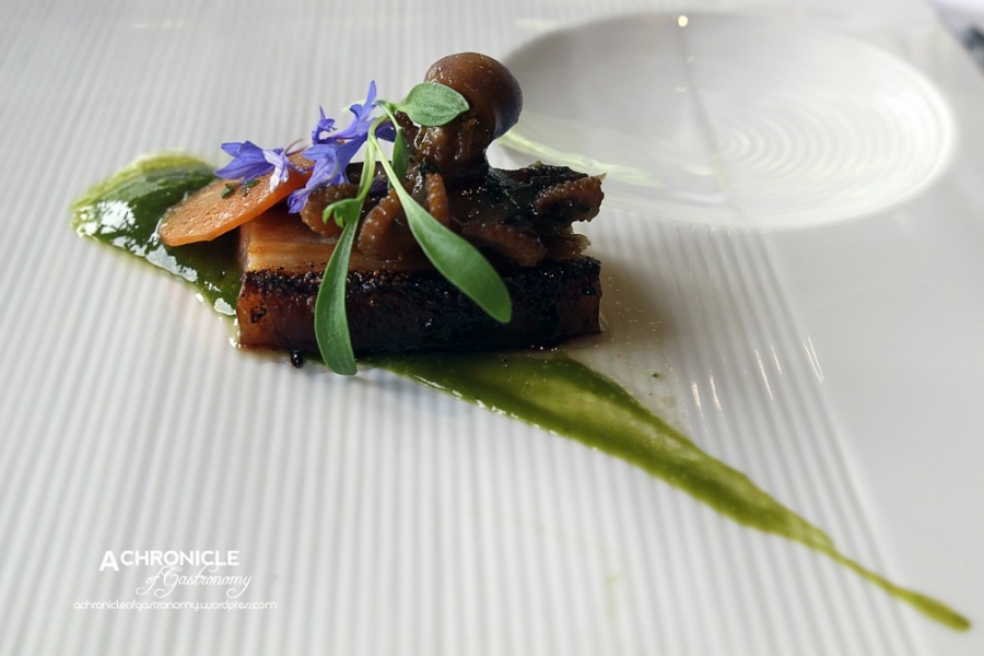 We started off with a selection of warmed breads, which included an olive bun and two heavily seeded buns. The first course was pork belly with baby octopus. Both meats were tender and enjoyable.