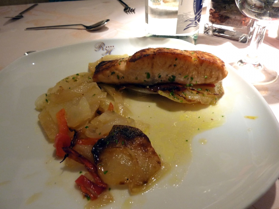 Mains: Grilled salmon on fried, sliced potatoes and a few bits of fried tomato