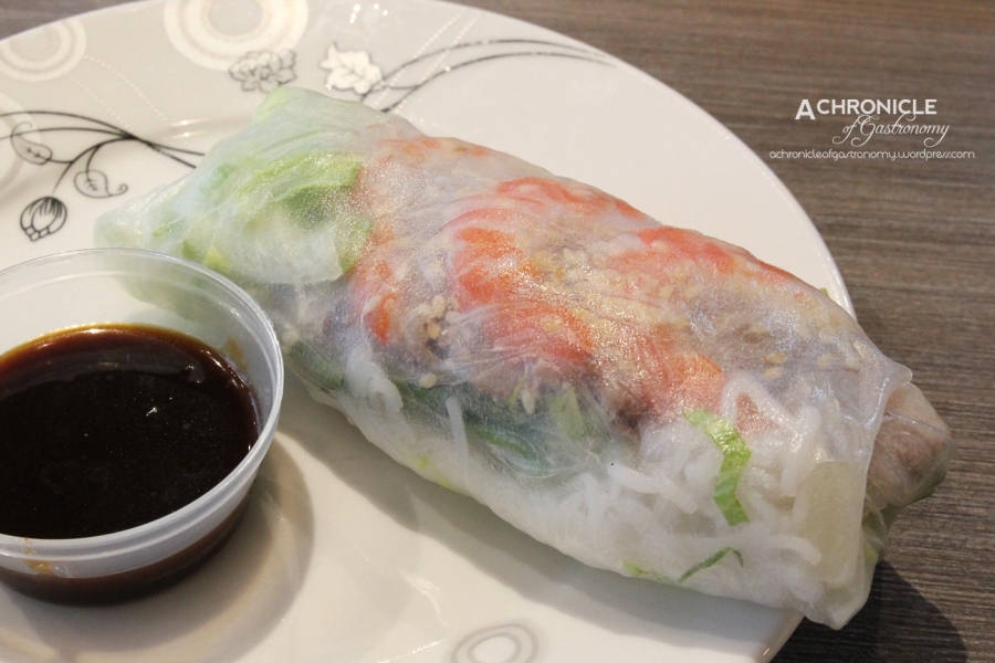 For lunch today I chose Mama’s Spicy Noodles (bun bo hue), which is a rice noodle soup with slices of tender beef, sausage, onion and salad. This dish originates from the central region of Vietnam. It was recommended to be eaten with some of the chilli mixture that was provided on the table – chilli flakes were mixed together with shallots, roasted garlic and some other seasonings, and it did indeed go very nicely with the bun bo hue. I thoroughly enjoyed the dish, particularly the flavoursome and clean-tasting soup. I also tried a pork and prawn rice paper roll with Twee’s special peanut hoisin sauce. I liked the balance of ingredients in the rice paper roll, which wasn’t overloaded with vermicelli and had a nice amount of proteins and lettuce. Apparently the crackling roast pork with avocado is the most popular of the rice paper roll varieties here.