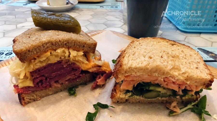 The Reuben was absolutely packed with pastrami. Whilst I was able to pick up the smoked salmon sandwich to eat, the Reuben required the use of a knife and fork for fear of dislocating my jaw. It also contained sauerkraut, Russian dressing and Swiss cheese on rye bread and topped with a pickle. Though there was a lot of meat, there was also enough sauerkraut to balance it out and enough cheese and dressing to tie it together without making a complete mess of the sandwich.