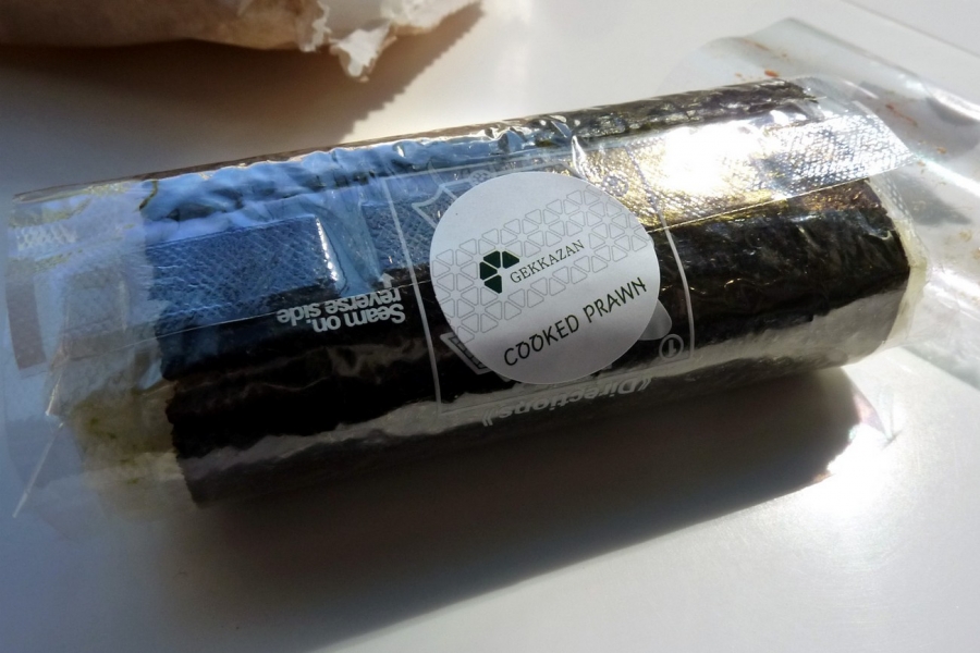 Thought I’d treat myself to a Dragon Roll at Gekkazan, which consisted of an inside out sushi filled with spicy tuna and a sliver of cucumber (the middle, pulpy bit) and topped with slices of eel and avocado. The takeaway price was $4.90. I was also eyeing the California handroll with cooked prawn and avocado. Normally I avoid California rolls because I don’t like seafood sticks. When I ordered the sushi the girl didn’t pick the one I was looking at ($3.10) but rather took one of the un-rolled ones, which I hadn’t noticed. The un-rolled one was obviously more expensive, but I also realised it was smaller. Oh well. At least I still got to enjoy the fresh nori. The Dragon Roll was small and so even more expensive than the price implies at face-value (well, I did say I was treating myself, didn’t I?). The cucumber acted well to freshen up the otherwise heavy flavours. It was good, but for the price and size I think the Spider Roll I had yesterday was better value. As a note for next time, I should probably specify whether I if I want the pre-wrapped handrolls rather than the do-it-yourself version.