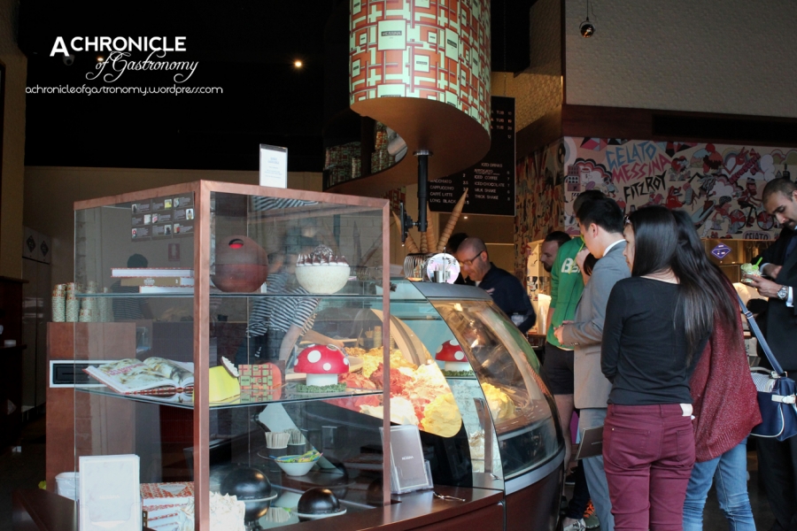 After dinner, K and I ventured one block east to try out Gelato Messina. The impressive, modern and sleek shopfront houses a cabinet showcasing around 40 different flavours of gelato and sorbet as well as some of their gelato cakes, such as the Black Forest (as seen on Masterchef) and Dr Evil’s Magic Mushroom.