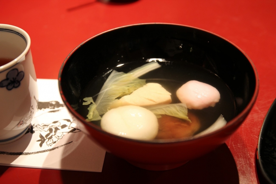 The main meal consisted of many small dishes: sweet beans, pickled vegetables (tsukemono), three pieces of sashimi, whale flipper (with a yellow sauce, possibly mustard based), a scallop, a piece of tofu, a brown, jelly-like substance, smoked fish, a prawn, taro, a cube of egg (mashed whites and mashed yolks pressed together in a rectangular prism shape), a slice of duck, prawn toast (prawn mix in half a slice of bread, then deep-fried), a slice of broiled pork and bowl of Japanese rice. There was a small bowl of mustard that was to be eaten with the pork, but I didn’t think they went that well together. I found the pickles too salty and the scallop was quite firm. I’m not sure it the scallop was intentionally cooked that way. My favourite component of the whole meal was the smoked fish.