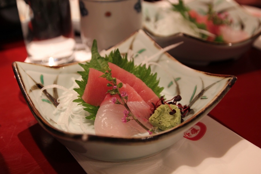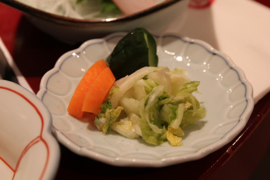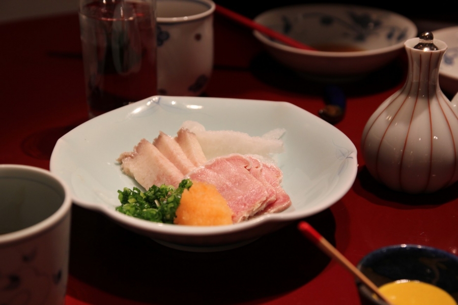 All of us ordered the third cheapest option, which was called Bura-bura shippoku (¥3750). The cheapest one (¥1575) was a child’s serve. More expensive options were for groups of 5 or more and included extra items such as a whole, stone-fried tilefish. For another ¥1575 we sampled some whale: tongue, flippers and belly. The whale was nothing of note: it was quite chewy and didn’t really taste like much. Maybe it was because we didn’t eat the actual meat. The whale was eaten with ponzu, spring onion and some sort of orange-coloured thing. Among the a la carte items were whole fried fish and also a whole bream served as sashimi. Boiled pork could also be ordered as take away. Our dinner started off with a clear soup with glutinous dumplings, fishcake and some vegetables.