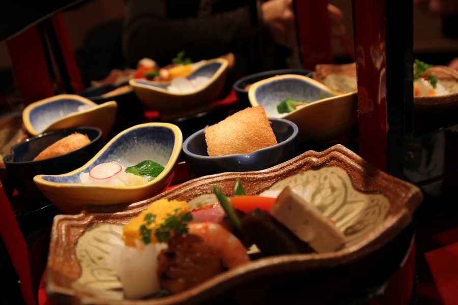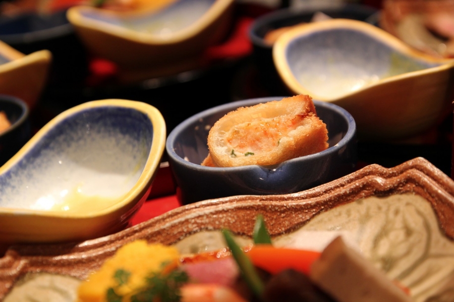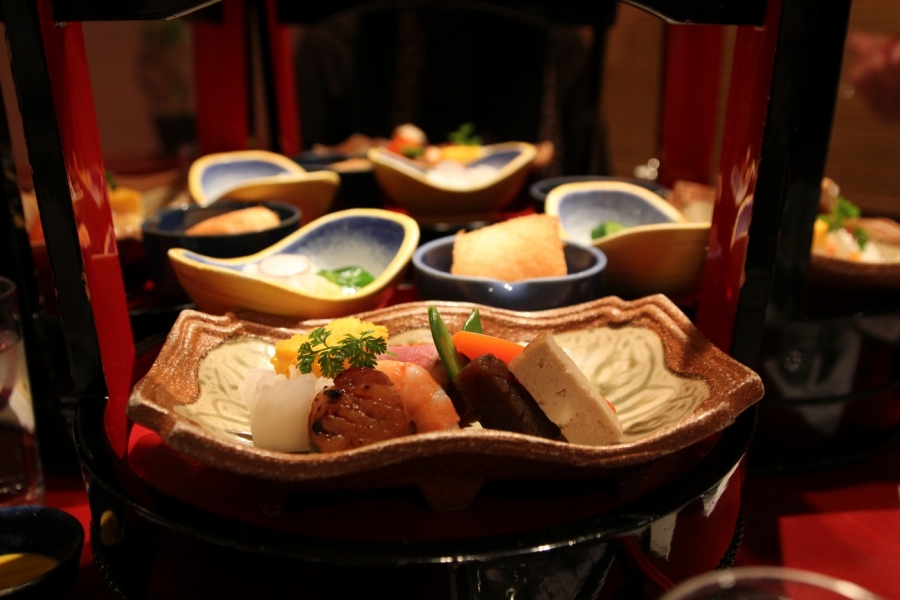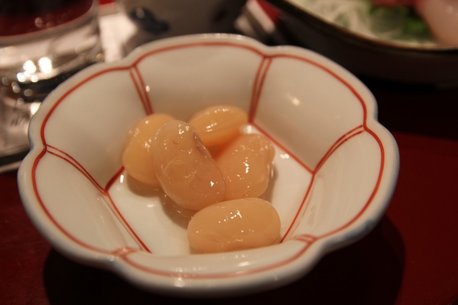 - Scallop, Tofu, ?Konnyaku, Smoked Fish, Prawn, Taro, Egg Dish, Duck Breast