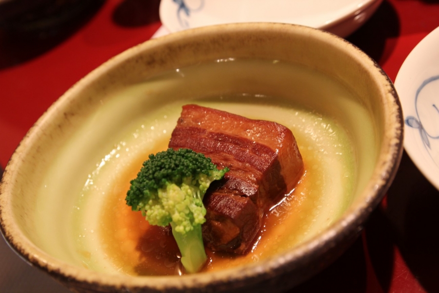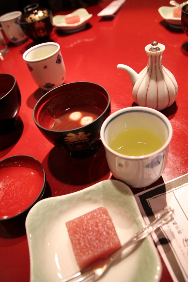 Dessert was a square of plum jelly and red bean soup with two small glutinous dumplings and salted plum blossom and also a cup of light, green tea. I could taste agar agar in the jelly and it was slightly grainy, as if it were pulpy bits of the plum. The red bean soup was much smoother than the Chinese version.