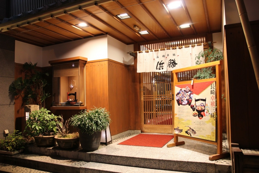 For dinner we wanted to try shippoku, which is a banquet particular to Nagasaki and takes cues from Japanese, Chinese and Western cuisine. One of the famous shippoku restaurants in Nagasaki is Hamakatsu. All the waitresses were dressed traditionally and there was a choice of Japanese or Western seating. We thought of sitting on the tatami mats, but because of A2’s knee we settled on Western furniture. I didn’t see anyone in the Japanese section.