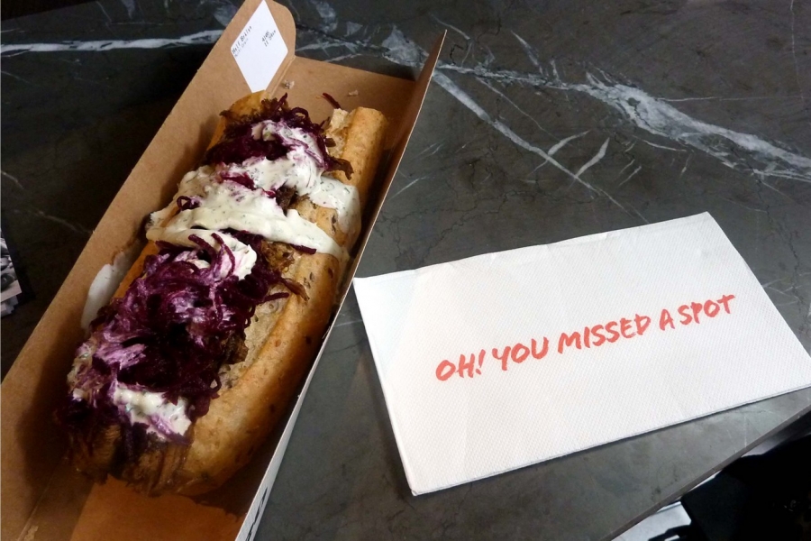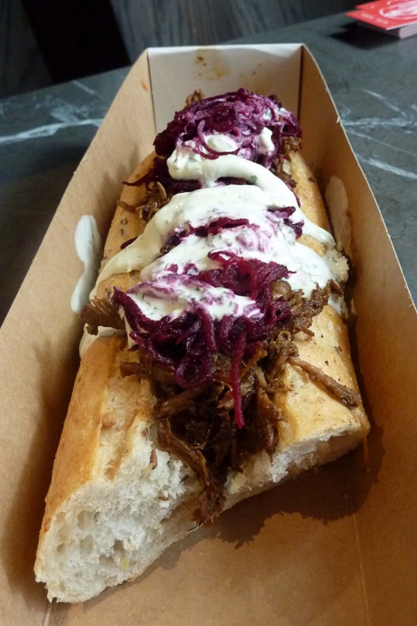I ordered a Brklyn (10 Hour Pulled Lamb, Shredded Pickle Beetroot, Baby Spinach & Herb-Whipped Fetta) in a multigrain roll. The half-size ($7.80) was huge and the fillings were generous. Because the roll was flat-ish, the lamb and beetroot were spilling over the top. The lamb was tasty and soft and the herb-whipped fetta went well with it, helping to break up the flavours.