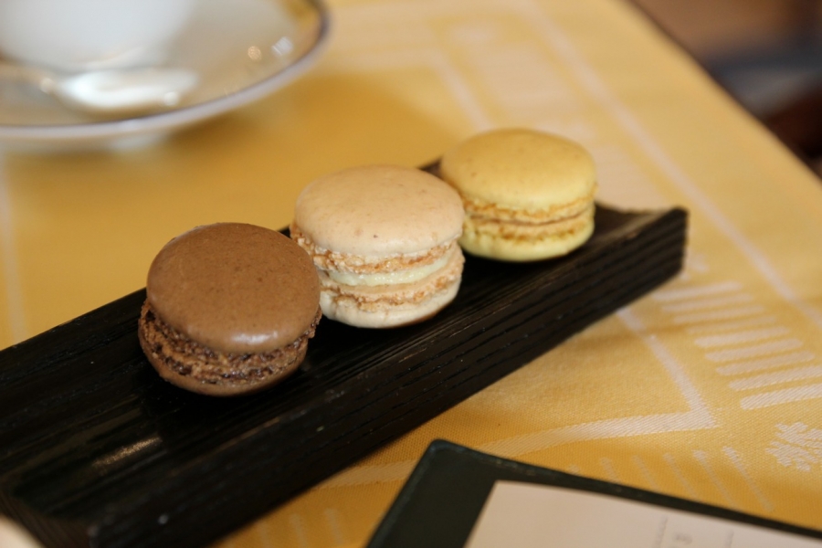 The Peninsula runs a well-known High Tea every afternoon. We ordered high tea for three and shared. High tea for two people is slightly cheaper than it is for one, but there’s the same proportion of food. The food arrived in a three-tiered platter. The top had a mango/passionfruit/coconut mousse, a cupcake with a cherry, a chocolate tart and a slice of pandan fruit cake. The second tier had cucumber sandwiches, salmon sandwiches, quiche, some sort of pastry and a ham and cheese roll. The bottom tier held six raisin scones and it was eaten with strawberry jam and clotted cream. Tea was also included and mum ordered a cappuccino (70HKD). She said the McCafe coffee was better (and less than half the price). The rest of us had the Peninsula Afternoon tea. After we had eaten most of our High Tea we were each given a lychee mousse topped with raspberry syrup and a few slices of almond. The total bill came to just under 1000HKD, and with the bill came three macarons: lemon, vanilla and chocolate.