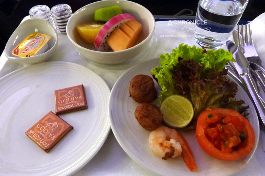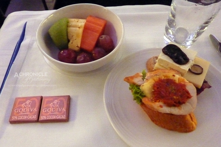 Refreshments 1.5 hours before touchdown was a slice of wholemeal baguette with Emmental and Bourdin cheese with fig and cheese, and a sundried tomato baguette slice topped with roasted chicken, pineapple slice and tomato coulis. The chicken was a bit weird and tasted a bit pasty.