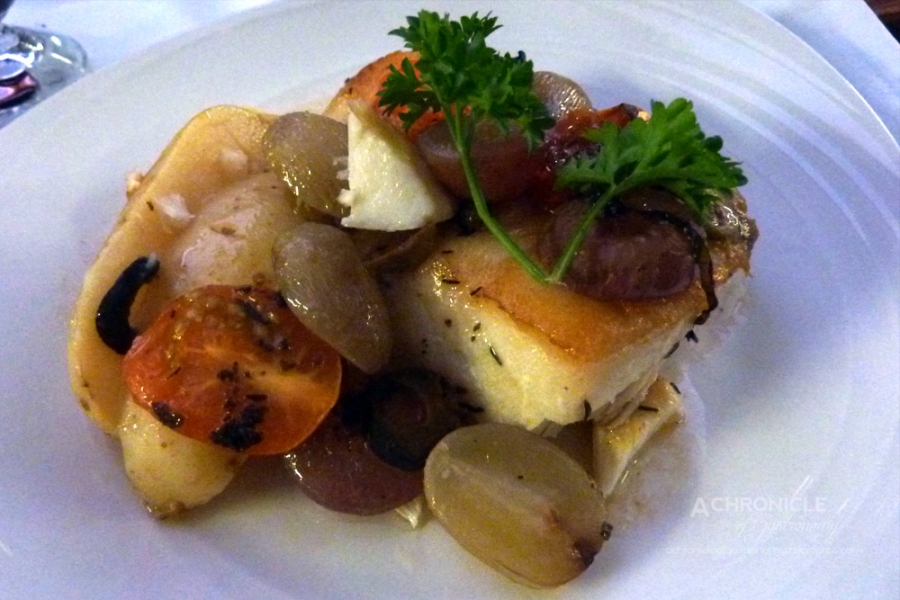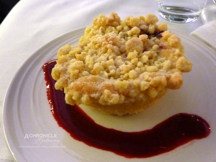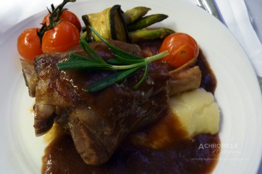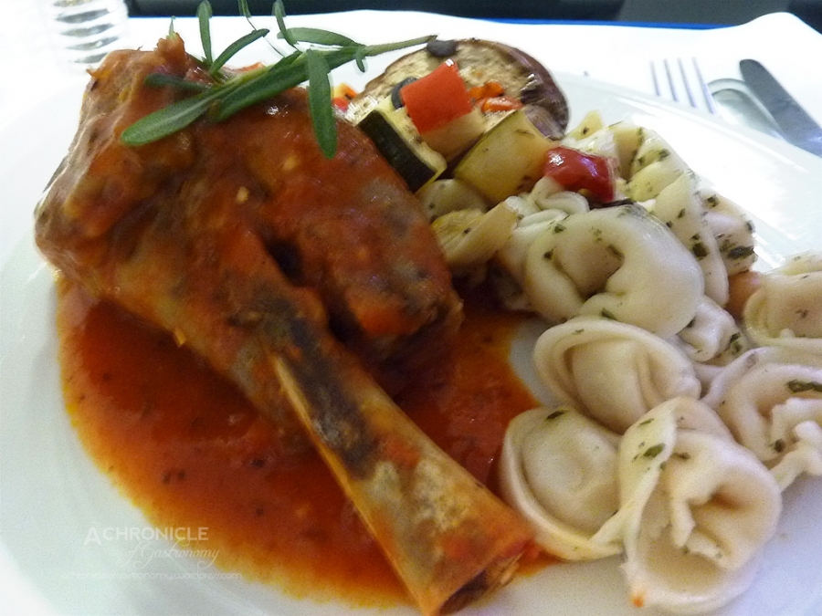 Appetisers were satay (this time the veggie sticks came with ketupak) and wasabi prawn and grilled scallops with papaya salsa and salad. The prawn was quite nice. The scallops were pretty brown and for a moment I forgot that the appetiser included scallops and thought it was some sort of potato or bread. Mains were: Braised lamb shank in coriander tomato jus (signature dish by Zubir Zain. With Mediterranean veggies, eggplant mille feuille, buttered cheese tortellini and lemon gremolata); Chicken rendang; Stir-fried prawn with dry chili w. rice, shiitake mushroom, bok choy and red peppers; Penne paste w. tomato coulis, veggies and parmesan. Mum’s braised lamb shanks were quite nice. I think it was nicer than the lamb shank in tomato jus. My cod was overcooked on one edge, but quite well cooked on the other. It was somewhat tasteless though; I had to add salt. The dessert was an apple and blueberry crumble. The crumble was more like a mix between a pie and a crumble. It had a cake-like base and sides.