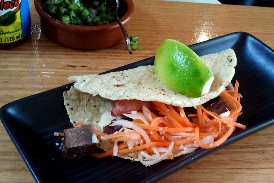- de Lengua y Cachete – Braised ox tongue & cheek, pickled veg & ghost chilli mayo ($6)