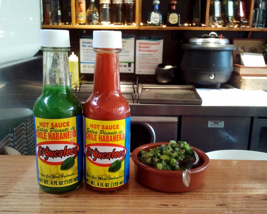 I was provided with 2 bottles of hot sauce – one with tomato and one without – and a small dish of salsa verde, which were recommended for the tacos.