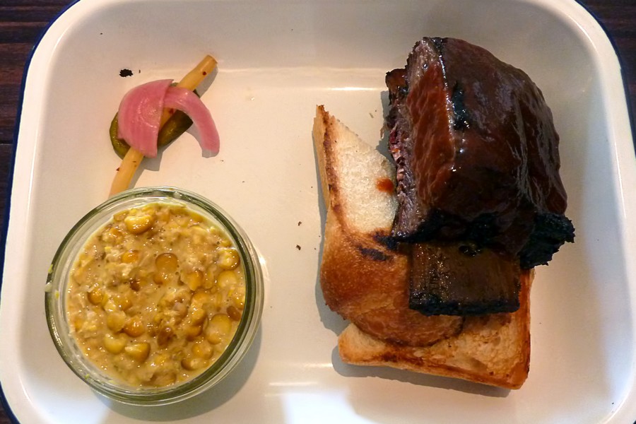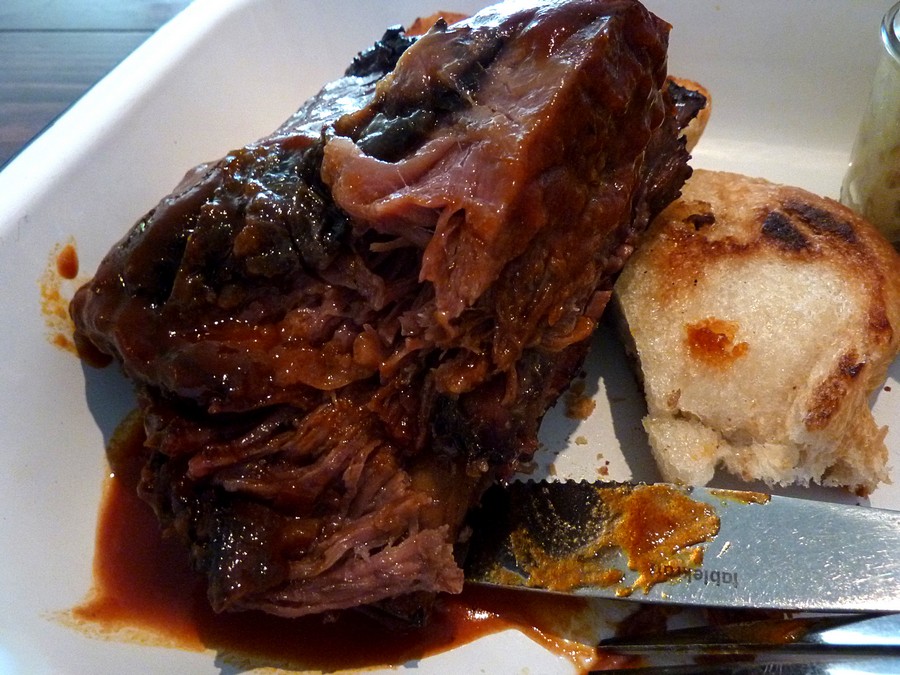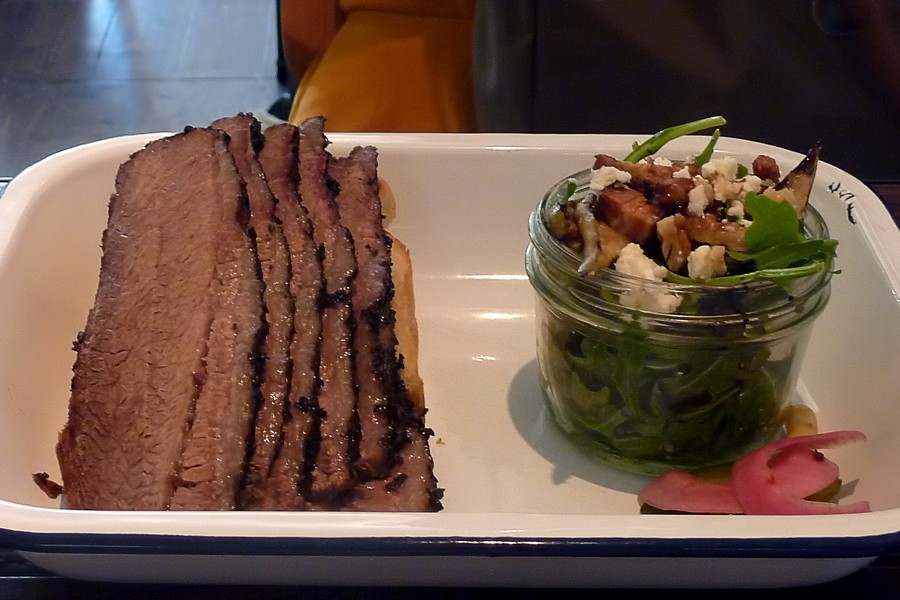 The aroma from the smokers of this American barbecue joint wafted towards us as soon as we stepped through the door. Both of us ordered a meat plate – beef short rib with a side of smoked corn for me and beef brisket with pear and bacon salad for C. The servings were large; we saw some plates of pulled pork go past and the pile of meat sitting on top of the Texas toast was quite impressive. The tender short rib fell off the bone and had a great smokey flavour. Angus beef brisket was also good, but perhaps not as great as the shortrib, even with the addition of the sauces provided on the table. I was expecting the smoked corn to be on the cob, but instead, it was a creamy side of corn kernels. It was nice, but I was just too full to eat all of it.