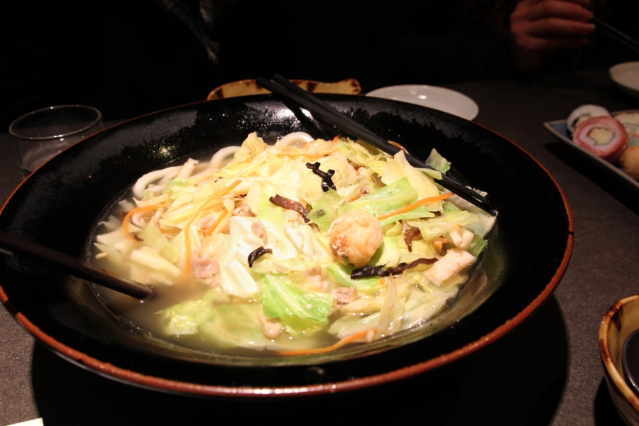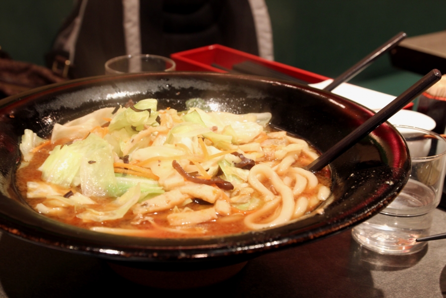 After missing out on the opportunity to try this restaurant earlier today, we returned for dinner. This restaurant was a nicely decorated and cleaner restaurant, which also had Japanese-style private rooms available. The waitress convinced mum to order a small platter of various fish paste items for ¥1000. We also ordered two bowls of udon – one with the ‘original’ broth and the other with miso (¥890 each). Having curry broth costs extra. Mum thought the udon at West was nicer because hers was a bit ‘soggy’. I think ours was fine. It was nice that there were a lot of veggies that came with the soup (mainly cabbage and beansprouts).