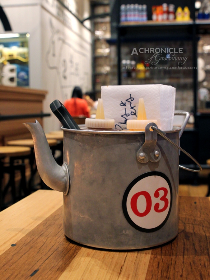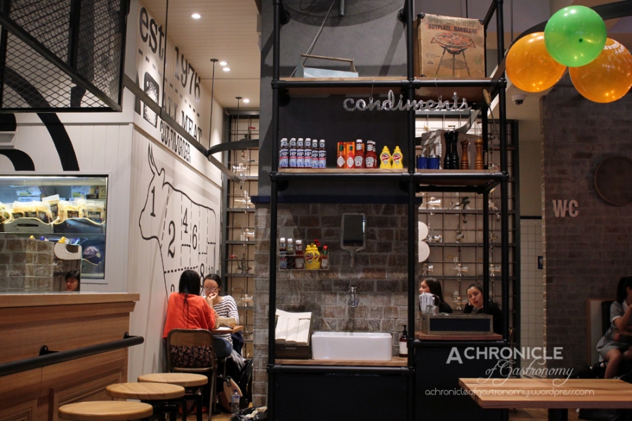 To celebrate its third birthday, Ribs & Burgers were offering a $3 birthday burger at all its stores so I thought it would be a good opportunity to check it out. I was told that the birthday burger was pretty much the same as the regular cheeseburger but without lettuce or tomato. After placing my order I was given a numbered watering can filled with cutlery, serviettes and sauce bottles and there was a station with water and some extra sauces for self-service. They even have a thoughtfully placed handbasin and some soap to wash those moreish sauces off your hands if you don’t want to resort to finger-licking.