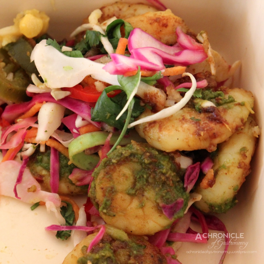 - Kid Kaboom – 15-hr Slow-Cooked Lamb Marinated in Masala w. Raita Yoghurt ($12.95) & Mr Parker’s Prawns – Grilled Ginger-Chilli Prawns w. Date Tamarind and Mint Coriander Chutney ($12.95)